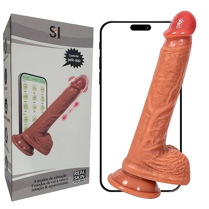 Pênis realístico com rotação e vibração, 9 modos de vibração, 9 modos de vai e vem e rotação, confeccionado em silicone, possui glande definida, textura de veias, escroto e ventosa para penetrações em ângulo reto. Com função de aquecimento. Produto a Longa Distancia