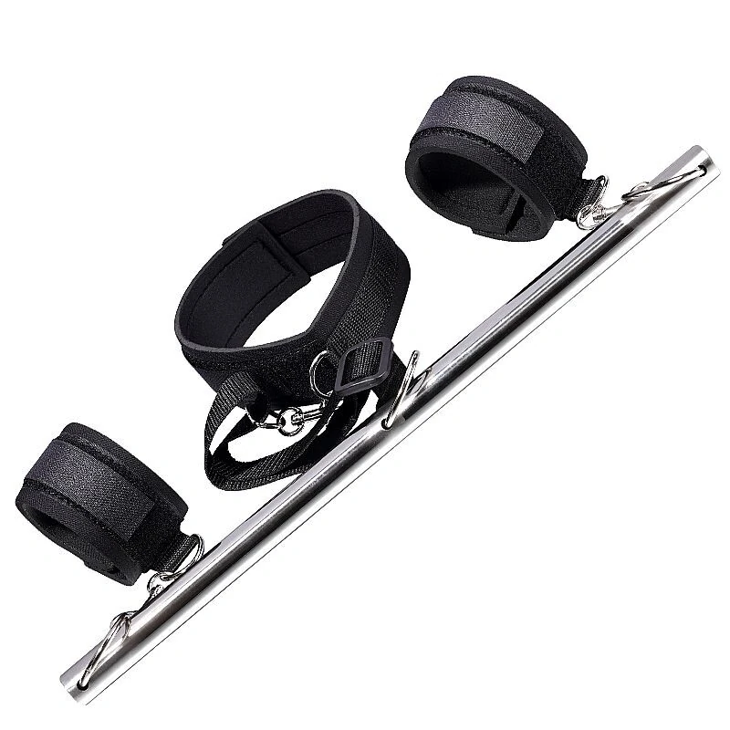 Coleira com par de algemas em nylon com barra de restrição em aço inoxidável.