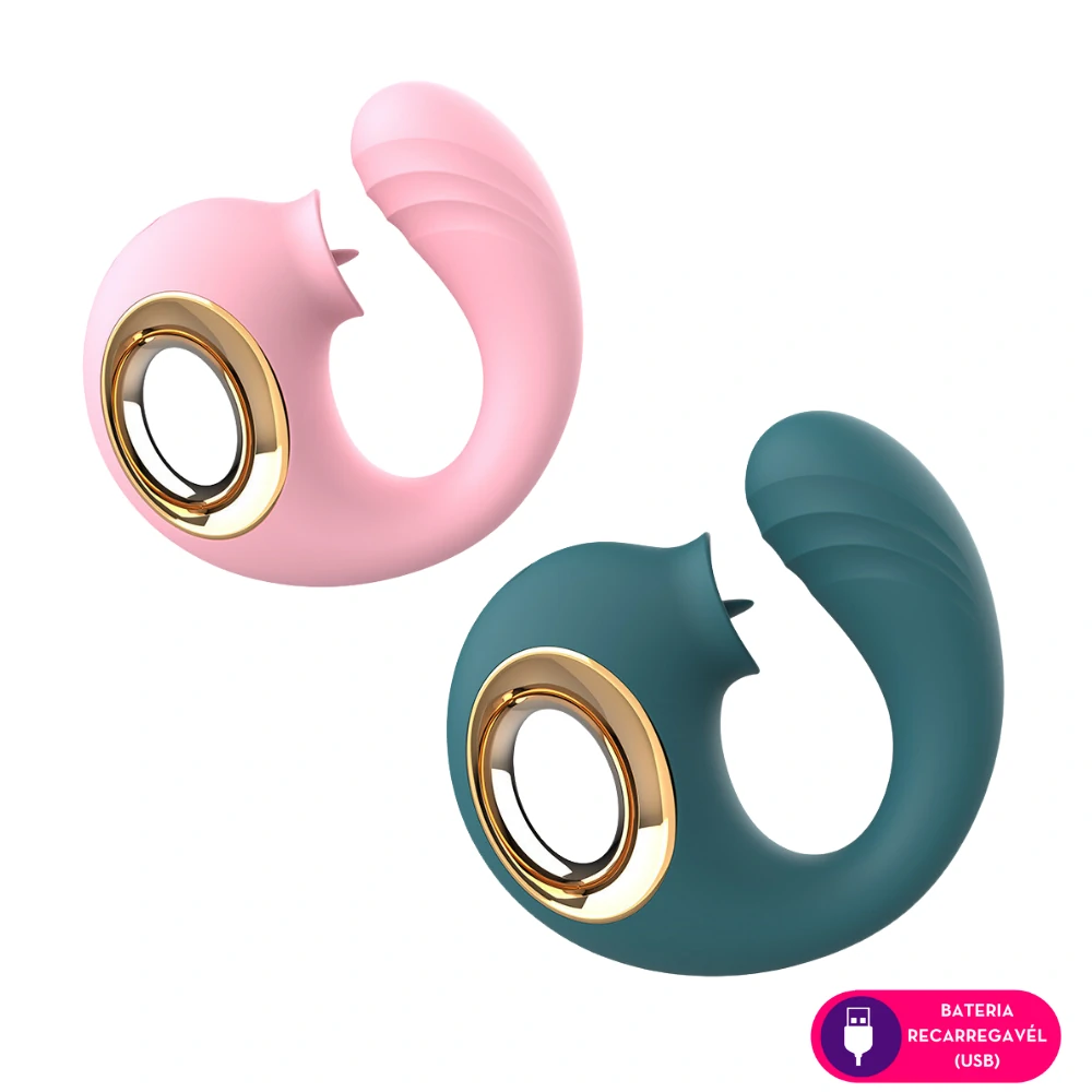 Vibrador ponto G com estimulador clitoriano. Design ergonômico, textura suave e toque macio. Oferece dupla estimulação para prazer intenso e personalizado.