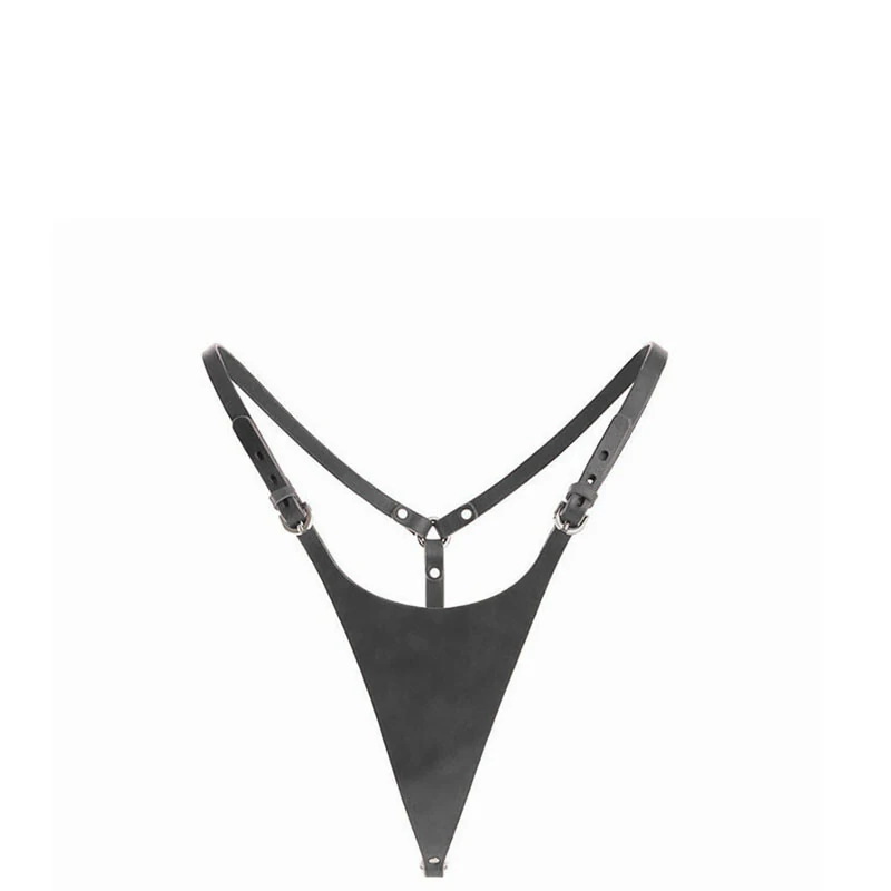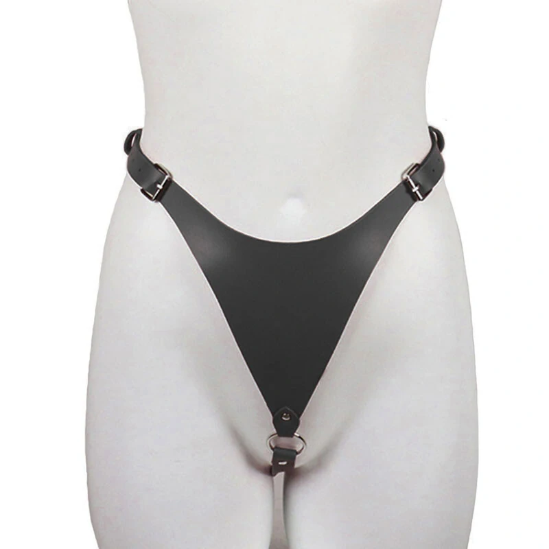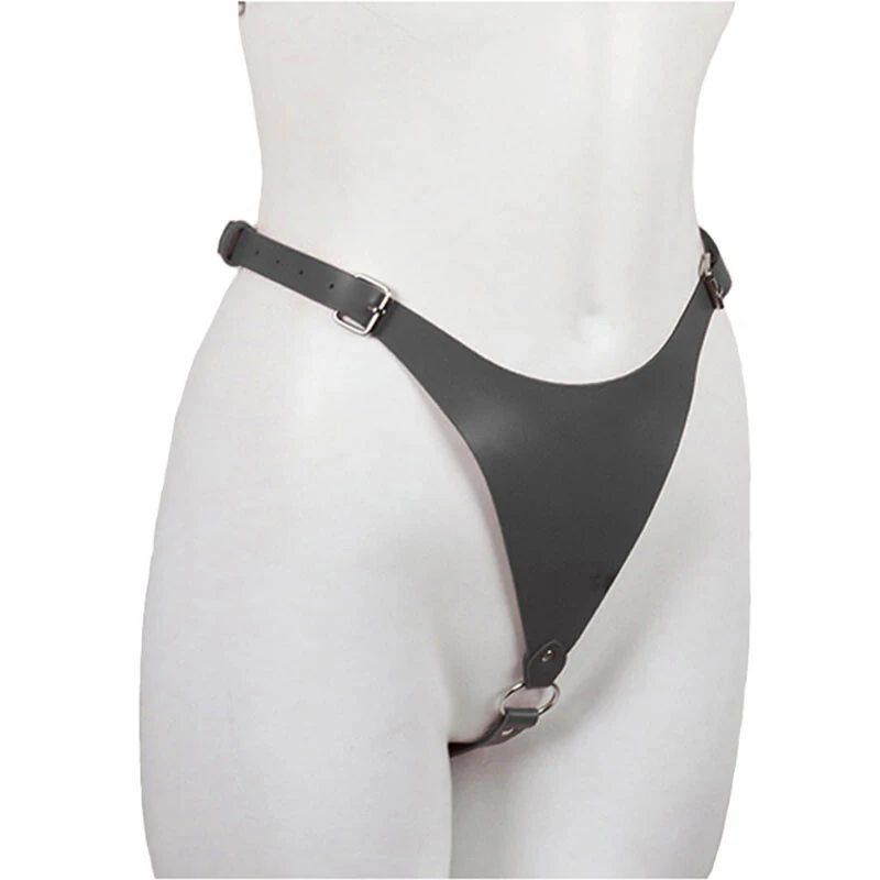 Calcinha vinil com tiras ajustáveis com fivelas.