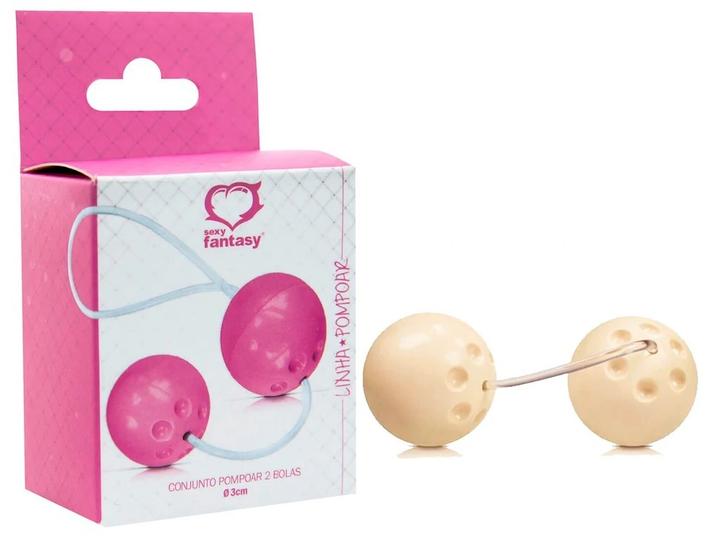 Conjunto pompoar composto por duas bolas projetadas em formato anatômico e confeccionadas com material resistente, unidas por um cordão de silicone atóxico.
